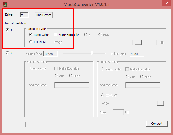 No. of partition¿¡¼ 1À» Ŭ¸¯ ÈÄ RemovableÀ» üũÇϰí Convert ¹öưÀ» Ŭ¸¯ÇÕ´Ï´Ù.